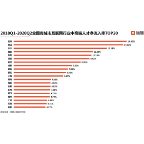 9月4日消息,獵聘發(fā)布的報告顯示,2018Q1-2020Q2全國各城市互聯(lián)網(wǎng)行業(yè)中高端人才凈流入率TOP20中,杭州互聯(lián)網(wǎng)行業(yè)中高端人才凈流入率最高14.80%。成都互聯(lián)網(wǎng)行業(yè)職場人幸福感最高,長沙、西安的互聯(lián)網(wǎng)人幸福感排第二第三。