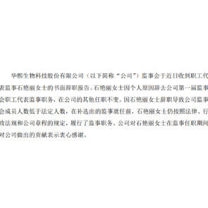6月17日消息,華熙生物公告稱,石艷麗因個(gè)人原因辭去公司監(jiān)事會(huì)職工代表監(jiān)事職務(wù),在公司的其他任職不變。石艷麗2019年薪酬為60.58萬元,持有公司1,600股股份。同時(shí),補(bǔ)選李冬妮為公司監(jiān)事會(huì)職工代表監(jiān)事。