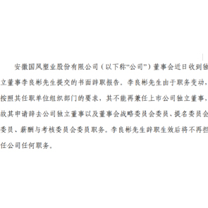 6月16日消息,國風塑業(yè)稱,李良彬由于職務變動,按其任職單位組織部門的要求,其不能再兼任上市公司獨立董事,故其申請辭去獨立董事及董事會戰(zhàn)略委員會委員、提名委員會委員等相關(guān)職務。李良彬2019年薪酬為4.7萬元。