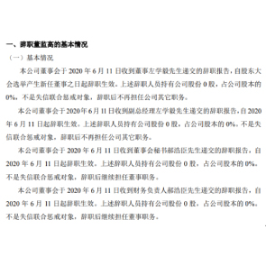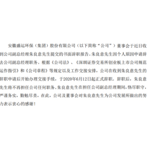 6月15日消息,盛運(yùn)環(huán)保稱,董事會收到公司副總經(jīng)理朱良意提交的辭呈。辭職后,朱良意將不再擔(dān)任公司任何職務(wù)。朱良意因個人原因申請辭去公司副總經(jīng)理職務(wù)。公司2018年披露財報顯示,朱良意稅前薪酬為48.87萬元,未持有公司股份。