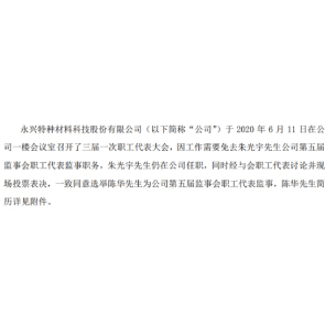 6月15日消息,永興材料稱,因工作需要免去朱光宇公司監(jiān)事會職工代表監(jiān)事職務(wù),朱光宇仍在公司任職,同時選舉陳華為公司監(jiān)事會職工代表監(jiān)事。公司2019年披露財報顯示,朱光宇薪酬為10.98萬元,未持有公司股份。