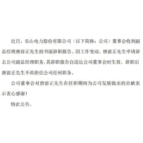 5月28日消息,樂山電力稱,收到副總經(jīng)理唐前正的辭呈。因工作變動,唐前正辭去公司副總經(jīng)理職務(wù),其辭職報告自送達(dá)董事會時生效。辭職后唐前正不再擔(dān)任公司任何職務(wù)。2019年唐前正從公司獲得的稅前報酬總額60.63萬元。