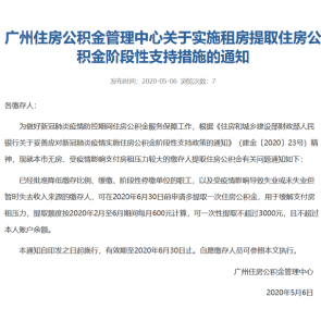 5月7日消息,廣州住房公積金管理中心發(fā)布的《通知》規(guī)定,可在2020年6月30日前申請多提取一次住房公積金,用于緩解支付房租壓力,提取額度按2020年2月至6月期間每月600元計算,可一次性提取不超3000元,且不超過本人賬戶余額。