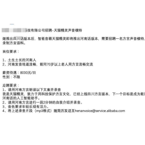 4月29日消息,阿里旗下天貓精靈確認,此次招聘對象是土生土長河南人,對河南話水平有一定要求,需能同70歲以上老人流暢交流,薪資待遇達8000元1天。2019年天貓精靈曾以700元1小時招募四川話聲模,合計5600元1天,低于2020年河南話的薪酬。