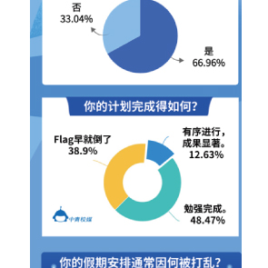 2月18日消息,中青校媒發(fā)布的調(diào)查顯示,66.96%的大學(xué)生給自己制定了假期計(jì)劃,12.63%的大學(xué)生計(jì)劃有序進(jìn)行,成果顯著,48.47%計(jì)劃執(zhí)行效果一般,但基本能夠完成,還有38.90%大學(xué)生“Flag立了就倒”(指計(jì)劃很快落空)。
