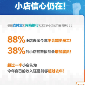 2月19日消息,支付寶和網(wǎng)商銀行發(fā)布的調(diào)查顯示,2萬(wàn)家小店中,88%小店表示2020年不會(huì)減少員工,38%的小店仍會(huì)增加雇員,超一半小店認(rèn)為2020年自己的收入還是能超2019年。此外,本周營(yíng)業(yè)小店環(huán)比增長(zhǎng)25%。