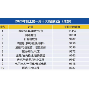 2月14日消息,智聯(lián)招聘發(fā)布的《春節(jié)求職用工周報(bào)》顯示,從成都求職者求職熱門職業(yè)上來看,財(cái)務(wù)崗位以29.2列第一。節(jié)后復(fù)工第一周成都平均招聘薪酬8460元/月,比2019年同期(7620元/月)提高11.0%?;饦I(yè)以11457元/月列最高行業(yè)。