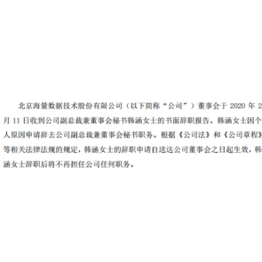 2月13日消息,海量數(shù)據(jù)公告稱,董事會收到公司副總裁兼董事會秘書韓涵的辭呈。韓涵因個人原因申請辭去公司副總裁兼董事會秘書職務(wù)。韓涵辭職后將不再擔(dān)任公司任何職務(wù)。其辭職后,將由公司董事長、法定代表人閆忠文先生代行董事會秘書職責(zé)。