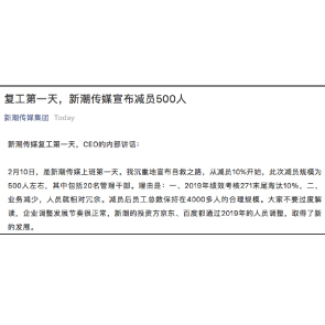 2月11日消息,新潮傳媒宣布,開工首日裁員500人 ,此次減員其中包括20名管理干部。具體做法為,采取績效管理制度,271末位淘汰10%的干部和員工,且2、3、4月全員不拿績效工資。同時,高管帶頭降薪20%,且承諾每月只領(lǐng)不超過5萬元的生活費。