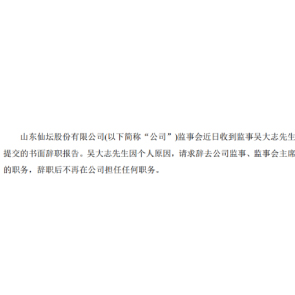 2月12日消息,仙壇股份稱,監(jiān)事會收到監(jiān)事吳大志提交的辭呈。吳大志辭職后不再在公司擔(dān)任任何職務(wù)。吳大志因個人原因,請求辭去公司監(jiān)事、監(jiān)事會主席的職務(wù)。公司2018年披露財報顯示,吳大志稅前薪酬為6.65萬元,未持有公司股份。