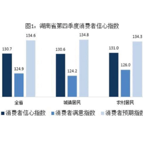 1月6日消息,湖南省統(tǒng)計(jì)局民意調(diào)查中心發(fā)布的調(diào)查顯示,湖南省第四季度消費(fèi)者信心指數(shù)為130.7,環(huán)比降1.3點(diǎn),處比較樂觀狀態(tài)。其中體現(xiàn)消費(fèi)者對(duì)當(dāng)前形勢(shì)看法滿意指數(shù)為124.9,環(huán)比降1.0點(diǎn),反映消費(fèi)者對(duì)未來形勢(shì)看法的預(yù)期指數(shù)為134.6。