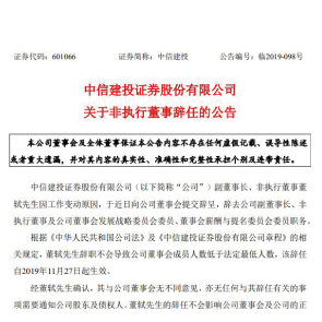 11月28日消息,中信建投稱,公司副董事長(zhǎng)、非執(zhí)行董事董軾因工作變動(dòng)原因,辭去公司副董事長(zhǎng)、非執(zhí)行董事等職務(wù)。目前,董軾已就任中央?yún)R金全資子公司中國(guó)建投,11月20日,已以公司黨委書記、董事長(zhǎng)身份主持相關(guān)論壇活動(dòng)。