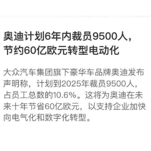 11月27日消息,奧迪稱(chēng),計(jì)劃到2025年裁員9500人,占員工總數(shù)的10.6%。將為奧迪在未來(lái)十年節(jié)省60億歐元,加快向電氣化和數(shù)字化轉(zhuǎn)型。同時(shí),將在電動(dòng)汽車(chē)和數(shù)字化領(lǐng)域新增多達(dá)2000個(gè)新職位,因此凈失業(yè)人數(shù)將為7500人。