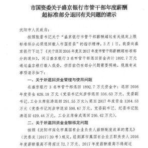 11月11日消息,沈陽市國資委發(fā)布的《關(guān)于盛京銀行市管干部年度薪酬超標準部分退回有關(guān)問題》顯示,盛京銀行黨委書記劉彥學,黨委副書記張濤,工會主席徐成2016、17年因多發(fā)薪酬被要求退回共計近1900萬元。