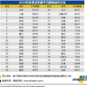 10月14日消息,智聯(lián)招聘最新發(fā)布的《2019年秋季中國(guó)雇主需求與白領(lǐng)人才供給報(bào)告》顯示,2019年秋季全國(guó)38個(gè)主要城市平均薪酬8698元/月,薪酬中位數(shù)為7001元/月。排名前三的北上深均破萬(wàn)元,其中北京的平均月薪達(dá)到11434元。