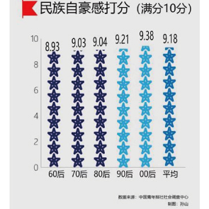 9月26日消息,中國青年報發(fā)布的調(diào)查顯示,在滿分10分的情況下,受訪者給自己的民族自豪感平均打9.18分。00后和90后的民族自豪感,相比其他年齡段更高,分別9.38分和9.21分。00后給自己的生活幸福感的打分在各年齡段中也是最高的(8.53分)。