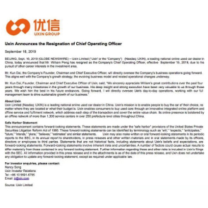 9月17日消息,優(yōu)信宣布,為了在投資領(lǐng)域追求其他職業(yè)興趣,公司首席運(yùn)營(yíng)官(COO)彭惟廉已于2019年9月15日辭職。在彭惟廉離職后,優(yōu)信創(chuàng)始人、董事長(zhǎng)兼CEO戴琨將直接負(fù)責(zé)公司未來的業(yè)務(wù)運(yùn)營(yíng)。彭惟廉在該公司工作了四年時(shí)間。