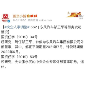 9月3日消息,國資委發(fā)布央企人事調(diào)整信息,聘任鄒正平、鐘俊為東風(fēng)汽車集團(tuán)有限公司外部董事,其中,鄒正平聘期至2021年7月,鐘俊聘期至2022年6月。外部董事制度即由公司外部人員擔(dān)任公司董事,并在董事會中占據(jù)一定比例和主導(dǎo)地位。