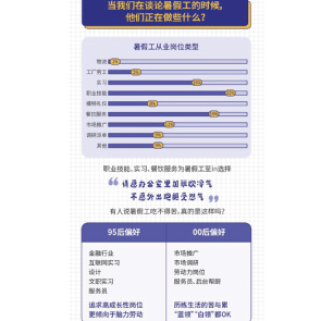 8月30日消息,JIANZHIMAO發(fā)布的《2019暑假職場生存數(shù)據(jù)報告》顯示,暑假工主力集中在95后、00后群體。16歲~22歲的暑假工占整體從業(yè)人員的83%,大部分為在校大學(xué)生。從薪資來看,一、二線城市的暑假工均薪遠(yuǎn)超三、四線城市,平均日薪110元。