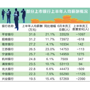 9月2日消息,隨著上市銀行半年報披露完畢,銀行業(yè)2019上半年人均薪酬情況浮出水面。2019上半年有20家上市銀行人均薪酬增長。其中,12家同比增幅超過10%,平安銀行、招商銀行人均薪酬均超31萬元,位居前兩名。