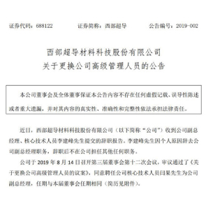 8月16日消息,西部超導公告稱,李建峰因個人原因辭去副總經(jīng)理職務,辭職后不在公司擔任其他任何職務。同意聘任公司核心技術人員閆果為副總經(jīng)理。閆果1974年生,長期從事實用化超導材料制備技術、超導電性和微觀結構研究工作。