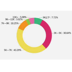 7月25日消息,WUTONGGUO發(fā)布的《2019屆中國高校畢業(yè)生薪酬報告》顯示,2019屆中國高校畢業(yè)生薪酬區(qū)間占比最大的是5000~7000元為43.29%,其次3K-5K區(qū)間,占比30.64%。華東地區(qū)畢業(yè)生崗位薪酬排榜首6395元。薪酬與學歷基本呈正相關趨勢。