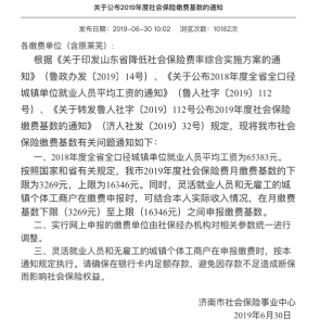 7月1日消息,濟(jì)南市事業(yè)保險(xiǎn)中心發(fā)布的《通知》規(guī)定,從2019年7月起,濟(jì)南市開始下調(diào)2019年度社會(huì)保險(xiǎn)繳費(fèi)基數(shù)上下線及繳費(fèi)標(biāo)準(zhǔn)。社會(huì)保險(xiǎn)費(fèi)月繳費(fèi)基數(shù)的下限為3269元,上線為16342元,同2018年度相比下降約6.8%。