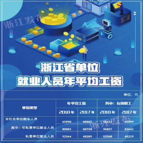 5月28日消息,浙江省統(tǒng)計局發(fā)布的統(tǒng)計公報顯示,2018年浙江省全社會單位就業(yè)人員年平均工資65898元,比上年增加5233元,增長8.6%。非私營單位就業(yè)人員年平均工資88883元,比上年80750元增8133元。其中,在崗職工年平均工資90857元。