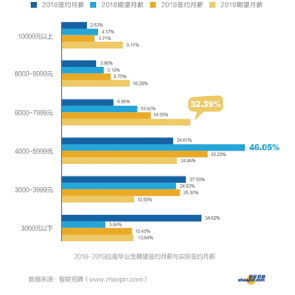 5月28日消息,智聯(lián)招聘發(fā)布的2019年大學生求職指南顯示,2019應屆畢業(yè)生期望月薪集中在6000-7999元,占比最高達32.39%。在就業(yè)地選擇上,新一線城市吸引力維持首位。從實際簽約月薪看,有七成2019應屆畢業(yè)生的簽約月薪在6000元以內。