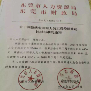 9月7日消息,東莞市人力資源局稱,從2018年7月起,東莞市就業(yè)困難人員工資差額補(bǔ)助比對(duì)標(biāo)準(zhǔn)由原來(lái)3854元/月調(diào)整為4454元/月。對(duì)在東莞實(shí)現(xiàn)就業(yè),且月工資低于市職工平均工資,給予最高280元/月的工資差額補(bǔ)助。