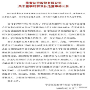 8月31日消息,華泰證券稱,浦寶英、陳寧、高旭、許峰和周勇五位董事辭職。同時(shí),提名丁峰、陳泳冰、胡曉、范春燕和朱學(xué)博為董事候選人。丁鋒、陳泳冰國資背景,胡曉來自阿里,范春燕蘇寧。4名董事候選人將不領(lǐng)薪酬。