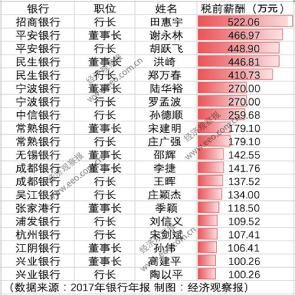 5月10日消息,經(jīng)濟(jì)觀察網(wǎng)統(tǒng)計顯示,2017年銀行業(yè)最高年薪被招行行長田惠宇以稅前522.06萬元斬獲,平安銀行董事長謝永林位列第二,為466.97萬元。平安銀行行長胡躍飛的2017年薪酬為448.9萬元,位居第三位。