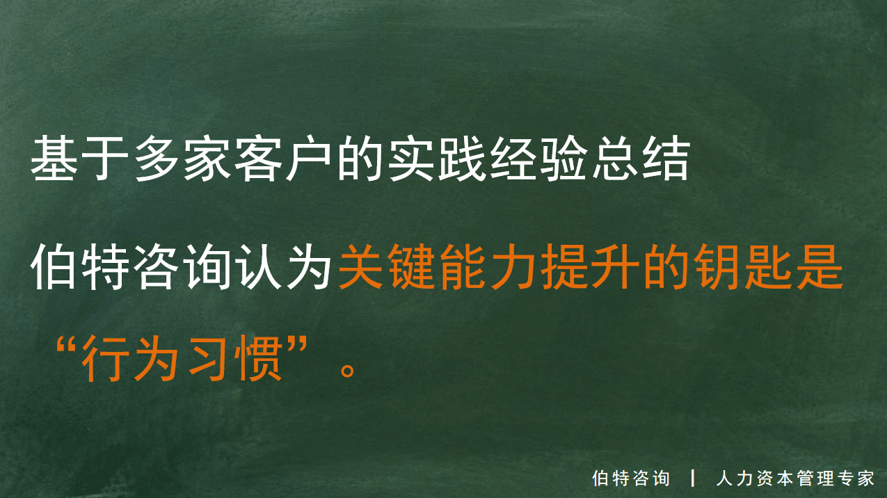 然后?這還用說嗎?當然是針對員工的勝任力短板,組織落實相應(yīng)的勝任力提升舉措了。按照伯特咨詢的勝任力模型理論架構(gòu),完整的勝任力包括背景條件、專業(yè)知識、關(guān)鍵能力、內(nèi)驅(qū)力四個部分,通常企業(yè)建模及應(yīng)用主要關(guān)注前三項內(nèi)容。從實踐經(jīng)驗來看,背景條件要求中多涉及崗位工作所需的“經(jīng)驗值”問題,通常與崗位歷練舉措相掛鉤;專業(yè)知識的提升路徑最為明確,專業(yè)課程+工作實踐+專業(yè)指導(dǎo),三位一體提升員工的專業(yè)水平。那么,關(guān)鍵能力呢?如何提升?是否有效?很多資深HR在談及這個話題時,往往沒有了之前的流暢感,有些對具體舉措語焉不詳,有些雖然談及業(yè)已實施的具體舉措,但也沒有表現(xiàn)出“智珠在握”的篤定感,多少對于實際成效有些疑慮。基于多家客戶的實踐經(jīng)驗總結(jié),伯特咨詢認為關(guān)鍵能力提升的鑰匙是“行為習(xí)慣”。
