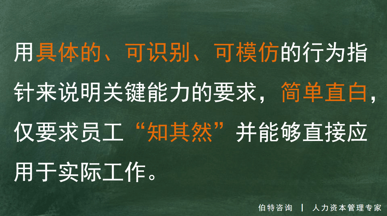 首先是“行為”。在勝任力建模過程中,需要對關(guān)鍵能力進行描述說明。傳統(tǒng)的描述說明方式類似于”下定義“,從概念、原因、作用等多個維度介紹某一項關(guān)鍵能力。這種致力于“知其所以然”、看似直接“治本”的手法在實際應(yīng)用中卻成效不佳,一方面較為專業(yè)、抽象的描述增大了員工的理解難度,另一方面即便員工理解了關(guān)鍵能力的說明,在轉(zhuǎn)化為日常工作中的具體表現(xiàn)時也存在障礙或困惑,同時往往也缺乏持續(xù)踐行該項能力的意愿和動力。本質(zhì)上,企業(yè)提出關(guān)鍵能力要求,是希望看到員工在日常工作中展現(xiàn)出相關(guān)能力表現(xiàn),即表現(xiàn)出“具體行為”。因此,我們修改了關(guān)鍵能力的描述方式,不再長篇大論、不再闡述原理,而是用具體的、可識別、可模仿的行為指針來說明關(guān)鍵能力的要求,簡單直白,僅要求員工“知其然”并能夠直接應(yīng)用于實際工作,這是關(guān)鍵能力指引發(fā)揮作用、在實踐中不斷提升的根本舉措。