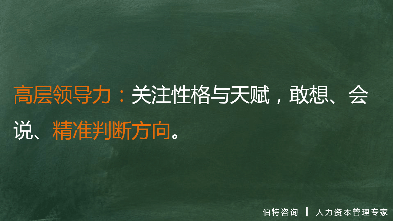 先看高層,我比較認可的指標(biāo)有:直覺、想象力、判斷力,戰(zhàn)略思維,愿景描述能力。大致的意思就是我們不需要高層干啥具體事兒,關(guān)鍵是敢想會說而且精準(zhǔn)判斷方向。根據(jù)我對很多高管領(lǐng)導(dǎo)力量表的研究,我認為這些能力的背后,性格與天賦超過技術(shù)和方法。換言之,高層的領(lǐng)導(dǎo)力最重要的價值是企業(yè)家決策,很難通過科學(xué)的方法進行培養(yǎng)。
