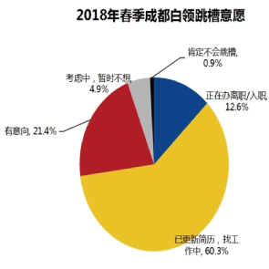 3月22日消息,智聯(lián)招聘發(fā)布的《2018年春季成都白領(lǐng)跳槽指數(shù)調(diào)研報(bào)告》顯示,2018年春節(jié),成都60.3%白領(lǐng)已更新簡(jiǎn)歷,總計(jì)72.9%白領(lǐng)在為跳槽而行動(dòng)。成都白領(lǐng)跳槽排全國第5。此外,成都有22.3%的白領(lǐng)一年內(nèi)會(huì)跳槽一次。