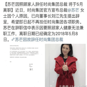 3月14日消息,時(shí)尚集團(tuán)官方宣布,總裁蘇芒女士因個(gè)人原因,已向董事長(zhǎng)劉江先生提出辭呈,希望即日起不再擔(dān)任時(shí)尚集團(tuán)各項(xiàng)職務(wù)。蘇芒在辭職信中表示,因要照顧家人健康無(wú)法兼職工作,離職日期已經(jīng)確定為2018年5月8日。