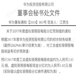 2月6日消息,華為集團(tuán)發(fā)布的《2017虛擬受限股分紅預(yù)測通知》顯示,2017年工會(huì)虛擬受限股每股預(yù)測收益2.83元,每股現(xiàn)金分紅1.02元/股。以應(yīng)屆畢業(yè)生為例,入職華為工作滿一至三年后,在5至10萬股,最高達(dá)20萬元。
