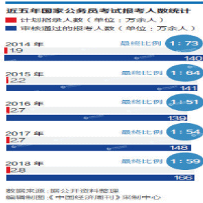 1月31日消息,國家公務員局統(tǒng)計顯示,2018年國考120多個中央機關及其直屬機構單位參加,計劃招錄2.8萬余人,最終165.97萬人通過報名資格審查,較2017年增17.34萬,通過資格審查人數(shù)與錄用計劃人數(shù)比為59比1。