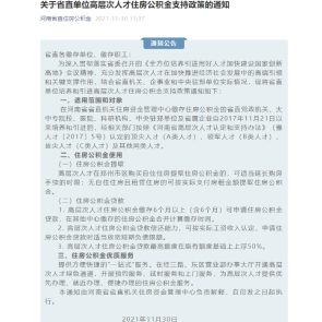 11月30日消息,河南省省直機(jī)關(guān)住房資金管理中心發(fā)布《通知》規(guī)定,高層次人才在鄭州買自住住房提取住房公積金的,可適當(dāng)延長購房手續(xù)的時(shí)限,無自住住房且租賃房的可按實(shí)際支付房租金額提取住房公積金。