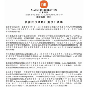 11月25日消息,小米集團(tuán)宣布,獎勵2024名選定參與者股權(quán)激勵計劃,共59788554股分紅。以小米股票19.26港元收盤計算,獎勵股票總價值超14億元,平均每位獎勵員工可得約70萬元。受獎勵的2023名選定參與者為非關(guān)系承受人。