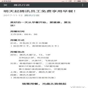 11月14日消息,騰訊宣布,2017年11月13日起騰訊員工可享受免費(fèi)早餐福利,適用范圍和人群擴(kuò)大不少。早上8:00~9:30(比新浪晚半小時(shí)),騰訊正式、外包員工均可憑借工卡可免費(fèi)享用早餐,包括深圳、北京、上海和成都的騰訊大廈等地點(diǎn)。