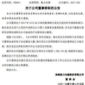 10月27日消息,格力電器公告稱(chēng),公司董事徐自發(fā)辭職,徐自發(fā)持有格力電器超120萬(wàn)股股票,在其離任后六個(gè)月內(nèi)不轉(zhuǎn)讓。辭職原因曝光。徐自發(fā)1954年生,2006年至今任河北京海擔(dān)保投資有限公司董事。2015年6月至今任公司董事。