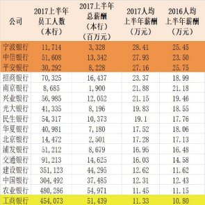 9月4日消息,基金君梳理16家銀行半年報(bào)數(shù)據(jù)顯示,和大銀行相比,部分中小銀行薪資是他們的2倍到2.5倍。寧波銀行、中信銀行、平安銀行占銀行薪資榜單的前三名,2017上半年平均薪資分別28.41萬(wàn)、27.93萬(wàn)和27.16萬(wàn)元。