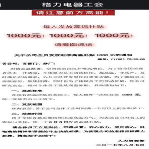 8月8日消息,格力發(fā)布的《通知》稱,公司決定在現(xiàn)有高溫津貼的基礎(chǔ)上再向每名員工發(fā)放1000元高溫補(bǔ)貼,而且是直接打到員工工資卡中。此次,格力的高溫補(bǔ)貼仍然采取“普惠制”,只要在格力工作滿一個(gè)月以上的所有員工都將享受。