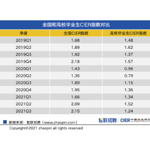 10月28日消息,中國人民大學(xué)中國就業(yè)研究所和智聯(lián)招聘發(fā)布《2021年三季度高校畢業(yè)生就業(yè)市場CIER報(bào)告》顯示,三季度高校畢業(yè)生招聘需求增加6.5%,但由于畢業(yè)生迎來秋季求職旺季,求職人數(shù)增加14.6%,導(dǎo)致指數(shù)環(huán)比下降。