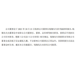 10月25日消息,首華燃?xì)夥Q,收到公司董事長錢翔的辭呈。錢翔向董事會申請辭去公司董事長、董事、總經(jīng)理等相關(guān)職務(wù),辭職后不再擔(dān)任公司任何職務(wù)。2020年公司披露年報顯示,錢翔從公司獲得的稅前報酬總額200.64萬元。