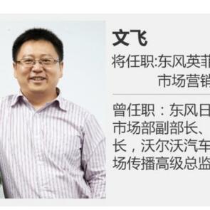 11月22日消息,英菲尼迪稱,前沃爾沃汽車中國(guó)銷售公司市場(chǎng)傳播高級(jí)總監(jiān)文飛加盟東風(fēng)英菲尼迪,將與總經(jīng)理陸逸、執(zhí)行副總經(jīng)理雷新一起,為英菲尼迪在中國(guó)市場(chǎng)的發(fā)展貢獻(xiàn)力量。文飛在汽車行業(yè)已有十年,曾入職東風(fēng)日產(chǎn)、沃爾沃。
