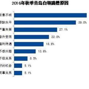 10月18日消息,智聯(lián)招聘發(fā)布的調(diào)查顯示,青島近6成白領(lǐng)在金秋選擇跳槽,有45.8%的白領(lǐng)因發(fā)展前景而選擇跳槽,其次39%因?qū)π匠晁讲粷M意。有27.2%的白領(lǐng)表示對事業(yè)非常有信心,事業(yè)信心指數(shù)為2.9,低于全國的平均水平3.07。
