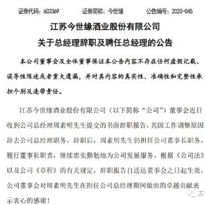 11月2日消息,江蘇今世緣酒業(yè)股份有限公司稱,總經(jīng)理周素明因工作調(diào)整辭去公司總經(jīng)理職務(wù)。辭職后,周素明仍擔(dān)任公司董事長職務(wù),履行董事長職。同時,今世緣聘任顧祥悅為公司總經(jīng)理。顧祥悅曾任江蘇省淮安市洪澤縣委常委、縣委組織部部長等職。